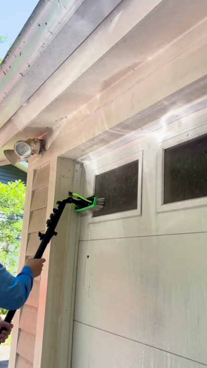 For exterior garage cleaning, we use a professional pure-water filtration system with a filtered water tank and a 50-foot extendable pole to safely clean garage doors and surrounding exterior surfaces without chemicals. This system removes dirt, dust, pollen, and buildup while drying spot-free. The result is a clean, glossy finish that enhances the overall curb appeal of your home and gives the exterior a refreshed, well-maintained look.