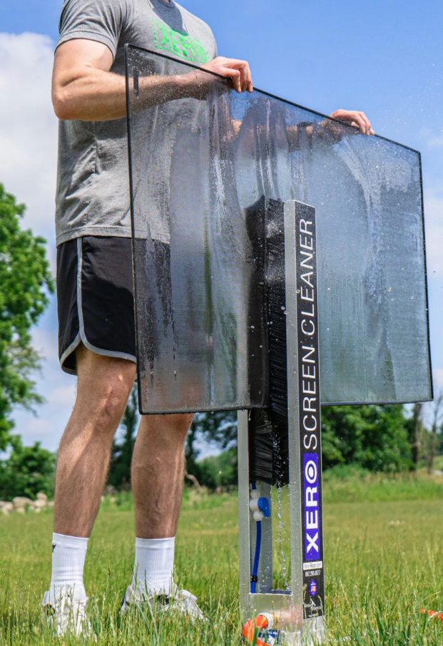 For screen cleaning, we use a professional Xero Screen Cleaner that connects directly to a hose. Each screen is placed into the cleaner and gently rotated while soft brushes and flowing water remove dirt, dust, and buildup from the mesh. This allows us to clean each screen thoroughly in under 15 seconds per screen.