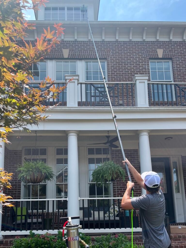 We use a professional Xero pure-water filtration system that filters minerals and impurities out of the hose water, allowing us to clean without chemicals. The purified water is fed through a 50-foot extendable pole with a soft brush and built-in rinse bar at the end, which delivers purified water directly to the glass.