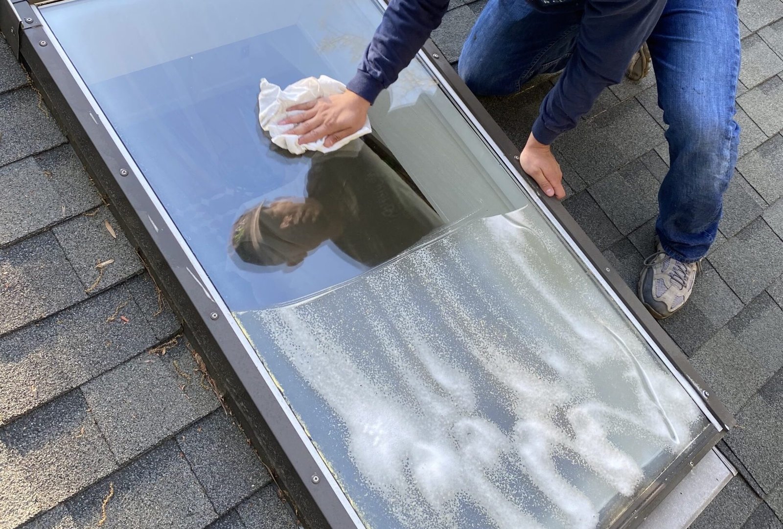 For skylight cleaning, we use a professional pure-water system with a filtered water tank and a 50-foot extendable pole to safely clean the glass without chemicals. When needed, we also use ladders to access the roof and ensure the skylights are cleaned thoroughly and correctly.